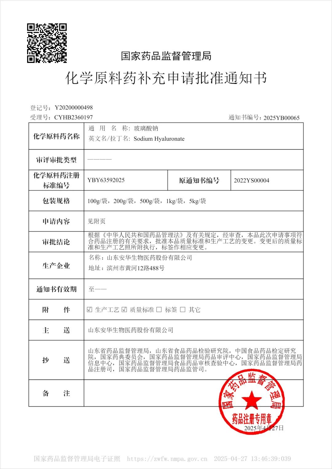 2025年04月27日,安华生物玻璃酸钠原料药新增分子量段50W-149W已获批准上市销售(登记号:Y20200000498),目前安华生物CDE登记A状态玻璃酸钠原料药分子量覆盖50W-390W。