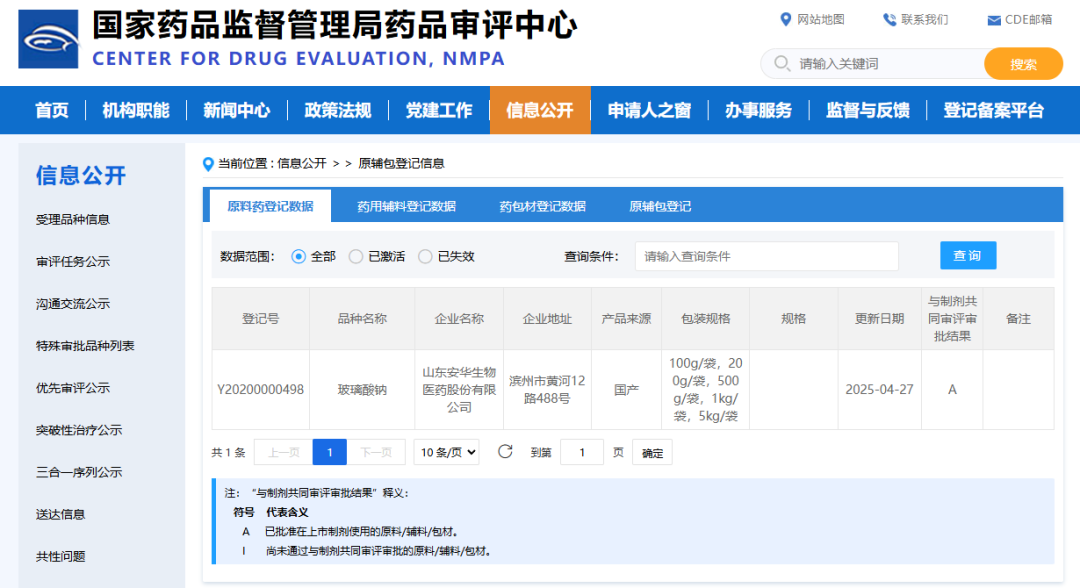 我司玻璃酸钠原料药CDE登记A状态分子量扩展获批